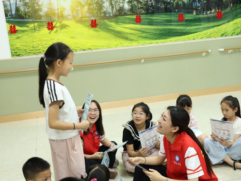 活動伊始,實踐隊員們精心策劃的“向陽花抱抱團”游戲瞬間點燃了現(xiàn)場氣氛。歡快旋律中,實踐隊員和孩子們圍作同心圓,隨“6朵向陽花開”的指令迅速尋找同伴相擁成團。這場精心設(shè)計的心理團輔,借數(shù)字互動破冰,讓孩子們在歡笑中敞開心扉、結(jié)識伙伴、提升表達能力,為稚嫩心靈播撒下陽光成長的種子。