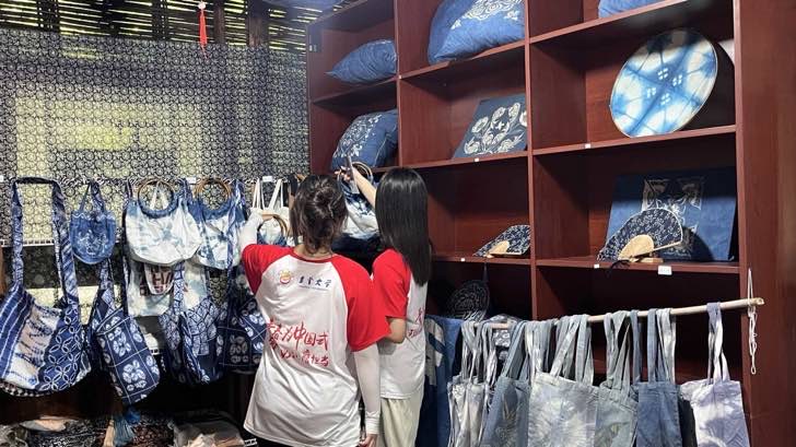 (圖為實踐隊隊員觀察蠟染手工藝品,圖為張蒙所攝)