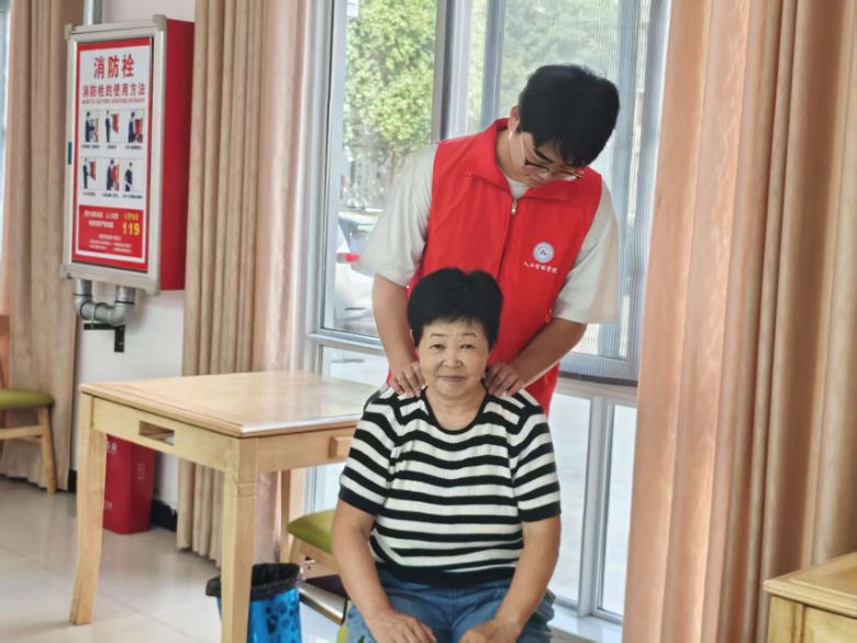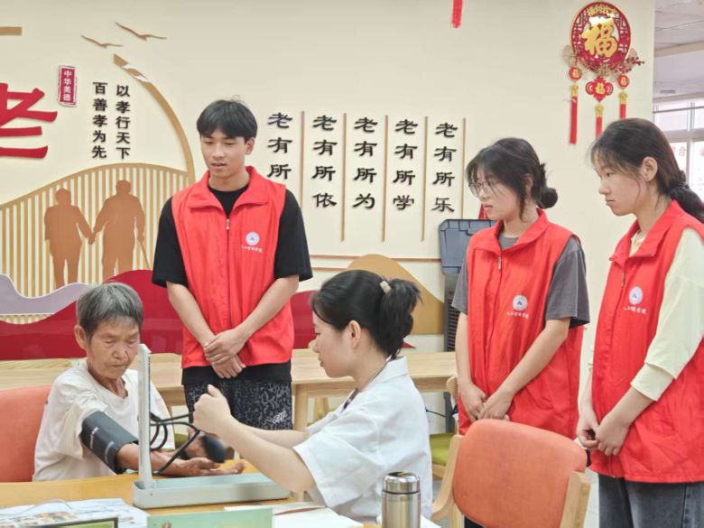 實(shí)踐迅速走向深入。在公共活動(dòng)區(qū),成員們自然融入老人中間,傾聽歲月沉淀的故事,關(guān)切詢問身體近況與日常起居,歡聲笑語驅(qū)散了角落的沉寂。當(dāng)醫(yī)務(wù)人員為老人進(jìn)行常規(guī)血壓測量時(shí),實(shí)踐隊(duì)員主動(dòng)化身得力助手——細(xì)心攙扶、耐心安撫、清晰記錄數(shù)據(jù),嚴(yán)謹(jǐn)細(xì)致的態(tài)度讓測量工作高效又充滿溫情。