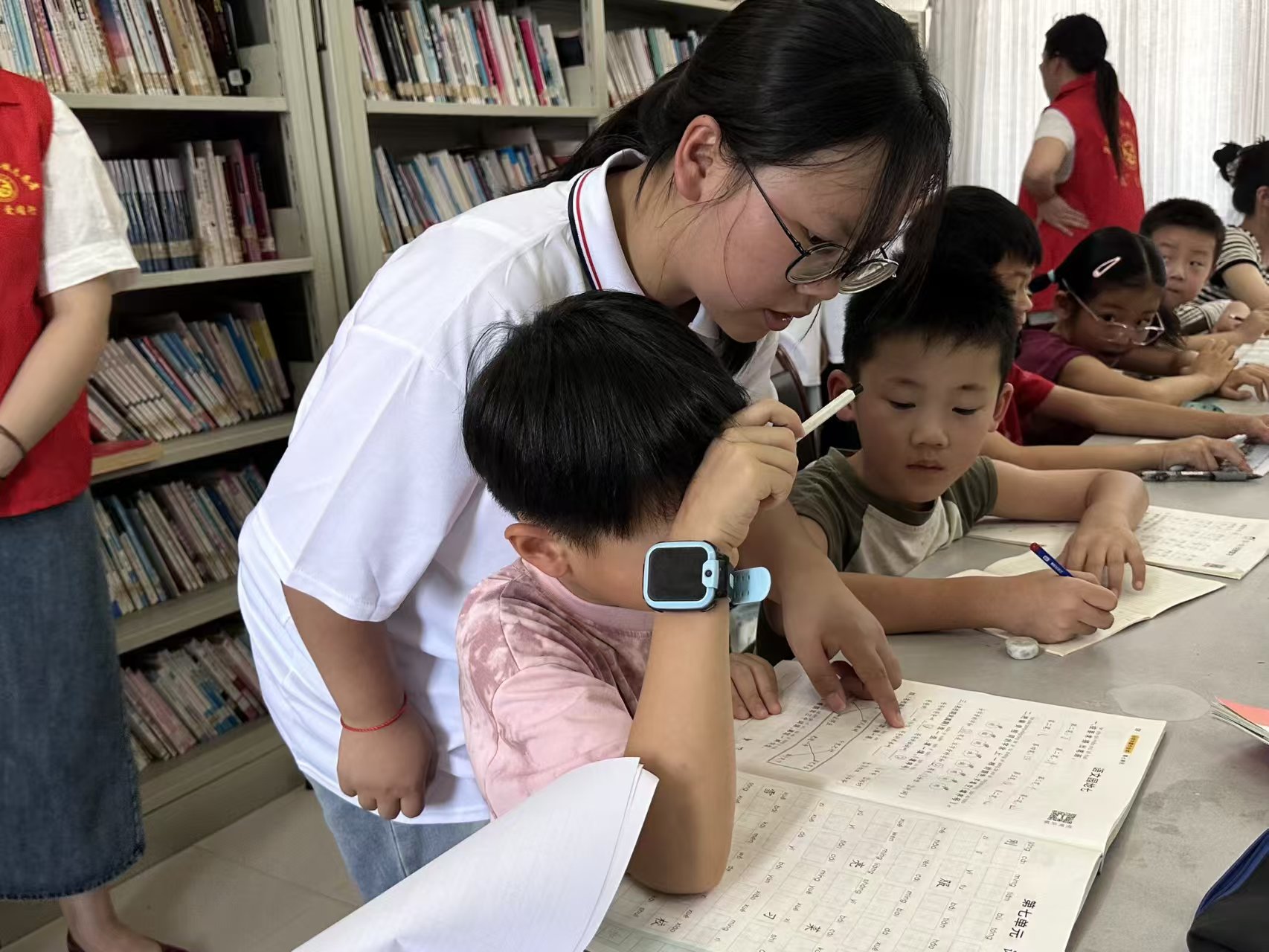 清晨的陽光灑進教室,志愿者們早已就位。面對孩子們五花八門的課業(yè)問題,他們變身“知識擺渡人”。數(shù)學題里的抽象邏輯,被轉化為田間地頭的實例;語文課文的深意,借著生動故事層層剖析。輔導中,志愿者們耐心的為小朋友們解答難題,面對數(shù)學難題,他們摒棄枯燥講解,以槐林鎮(zhèn)的建筑、作物為素材,將幾何圖形融入房屋結構,把數(shù)學運算與農(nóng)田收成關聯(lián),讓抽象知識“落地生根”;講解語文生字,從漢字的象形起源講起,“‘槐’字左邊是木,就像槐樹的枝干,右邊的‘鬼’,藏著古人對樹木靈性的想象”,生動詮釋讓生字學習趣味滿滿。孩子們從最初的拘謹,到主動提問、分享思路,學習氛圍里的溫度,是志愿者耐心澆灌的成果,為鄉(xiāng)村兒童的成長筑牢知識基石。志愿者們不僅解疑答惑,更傳遞學習方法。鼓勵孩子們“錯題分類”“聯(lián)想記憶”,讓被動接受變?yōu)橹鲃犹剿。教室里,專注思考的神情、豁然開朗的笑聲,是知識耕耘后的收獲,為鄉(xiāng)村兒童的暑期學習筑牢根基。