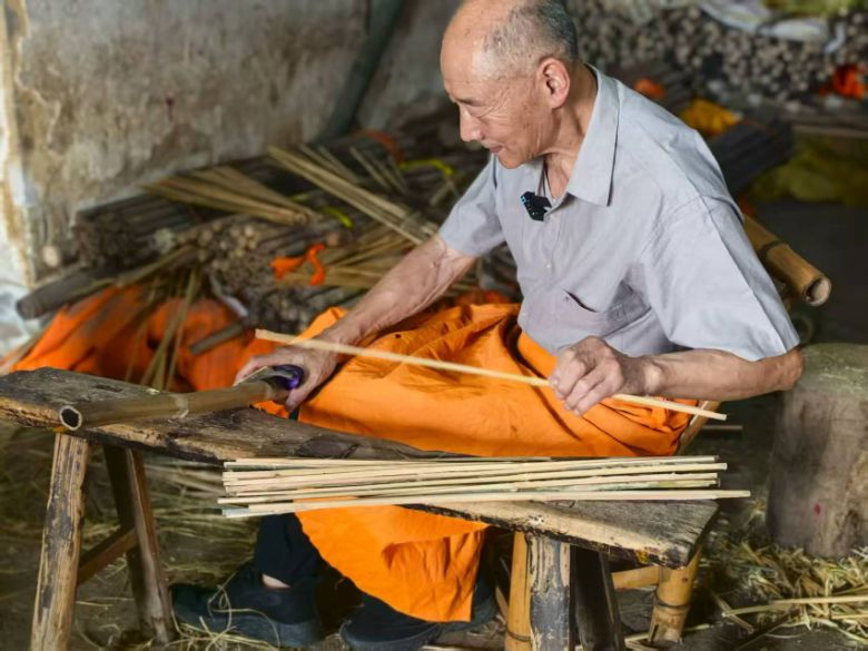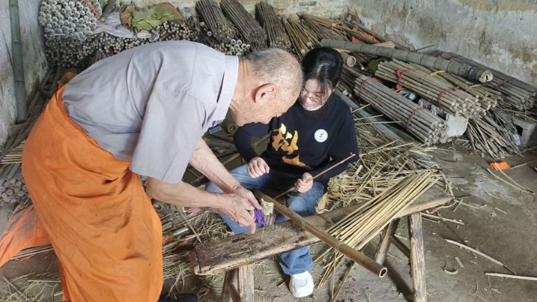 在王延松老師傅的示范后,成員董麗拿起一根毛竹嘗試刮青。剛下刀便因力道過猛,竹面出現(xiàn)一道深痕。“莫急,”王延松老師傅便耐心指導她。不久,成員董麗終于削出一根光滑的傘骨時,額頭已滲滿汗珠:“原來看似簡單的一步,藏著這么多門道。”