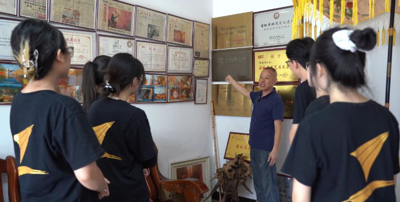 “同學們,請看這些牌匾。”廠長鄭國民指著墻上的牌匾。墻上的榮譽牌匾記錄著歲月的饋贈:“安徽省非物質(zhì)文化遺產(chǎn)”“中國油布傘第一品牌”“安徽省老字號潤澤”……鄭國民摩挲著“中華人民共和國輕工業(yè)《油布傘》行業(yè)標準主要起草人”等榮譽證書,語氣里帶著自豪:“2017年我們的油布傘制作技藝入選省級非物質(zhì)文化遺產(chǎn),并且榮登2025年央視非遺晚會,同時今年5月4日,我受世界技能博物館的邀請,前往上海展演油布傘。”