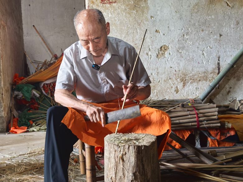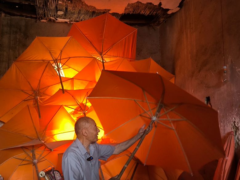 油布傘的制作要經(jīng)88余道工序,從選竹到成傘需歷時月余。盡管如此,可是當油布傘緩緩撐開,陽光透過黃色的傘面,在地面投下細碎的光斑。桐油的清香混著汗水的微咸,讓在場的人不禁感慨。