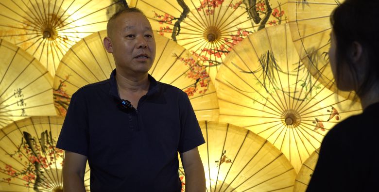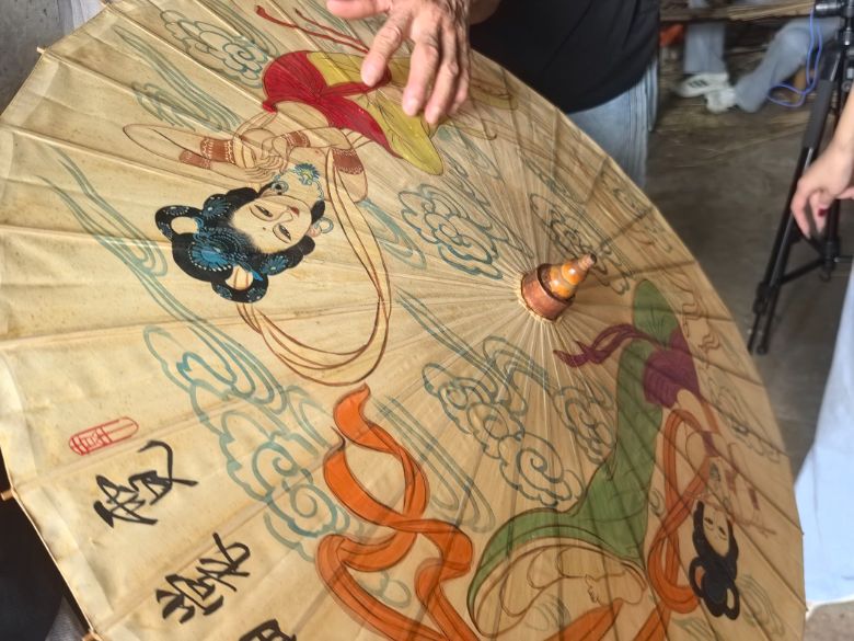 他拿起一把傘面繪有敦煌飛天的油布傘,傘骨輕轉(zhuǎn)間,桐油浸潤的棉布發(fā)出細微的聲響:“古人說‘傘開天地闊’,油布傘用皖南深山的水竹做骨,績溪棉布做面,涂上本地的熟桐油,能做到‘晴雨兩用,三年不腐’。這不僅是物件,更是涇縣人的生活哲學——既能遮風擋雨,也能抬頭見日。”