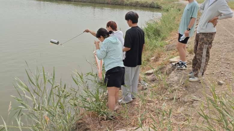 首先,老師們對漁場飼料進行了檢測,觀察魚苗的生長;然后團隊隊員們使用專業(yè)的采樣設(shè)備,沿著河道有條不紊地開展水樣采集工作,為后續(xù)送往實驗室進一步檢測做準備。