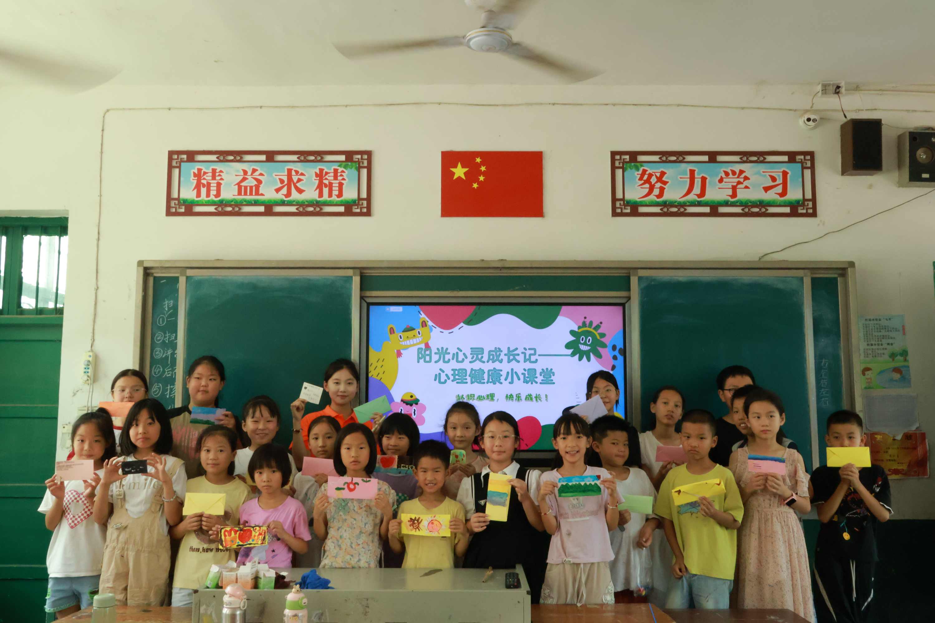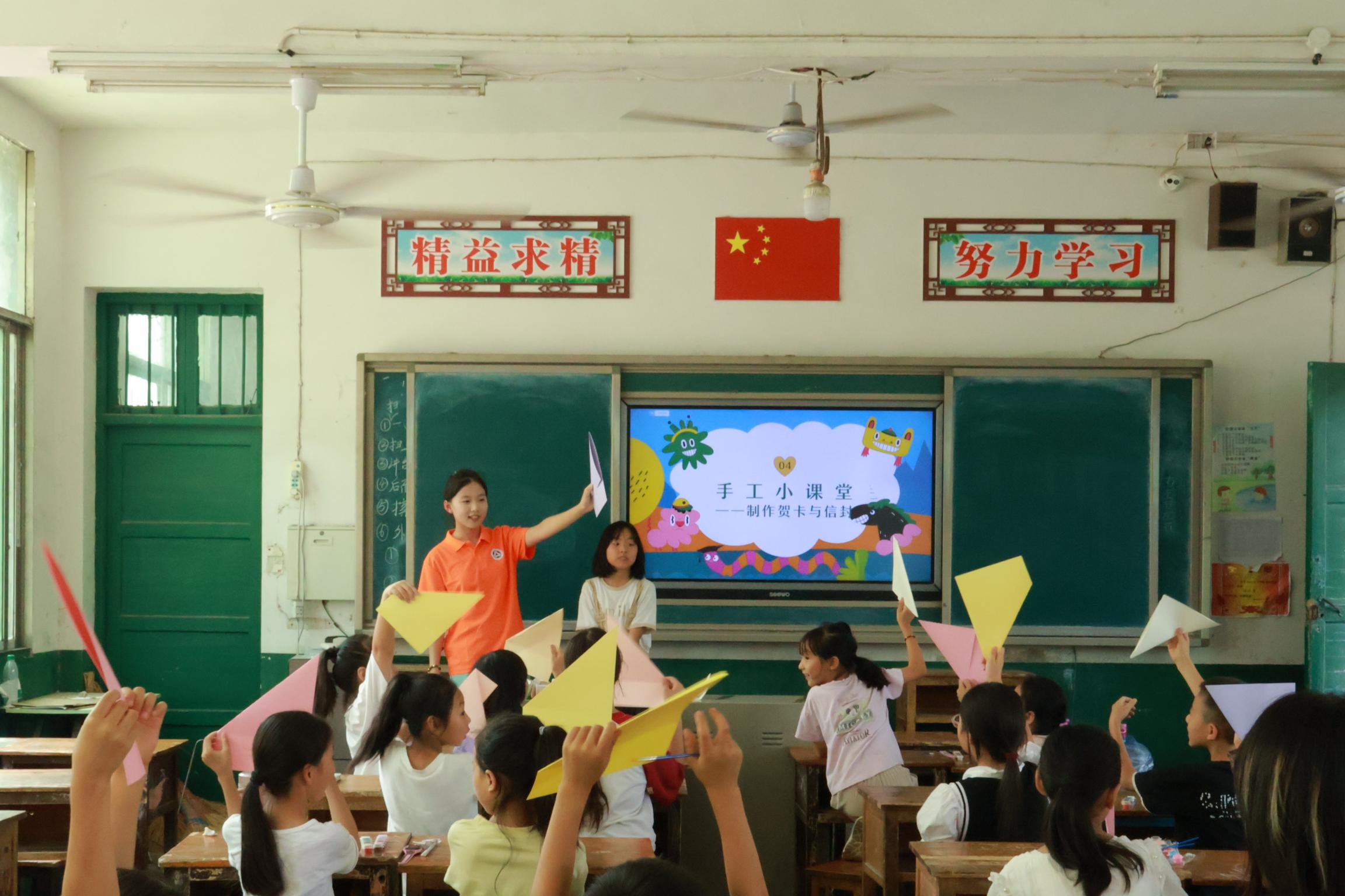 心理健康教育課程則更顯細(xì)膩。實(shí)踐團(tuán)成員司希睿將情緒比作小怪獸,讓小朋友們?cè)谇榫w的角色扮演中體悟情緒變化,在互動(dòng)中引導(dǎo)其表達(dá)感受。手工環(huán)節(jié),實(shí)踐團(tuán)帶來(lái)的彩色卡紙成了孩子們眼中的寶貝。授課人的示范下,孩子們將卡紙對(duì)折成信封,用彩筆繪制五角云朵、星星、花朵等圖案。“老師說(shuō)心中的小烏云散開(kāi),陽(yáng)光才能照進(jìn)來(lái)。”一位小女孩在自己的手作賀卡中寫(xiě)道。