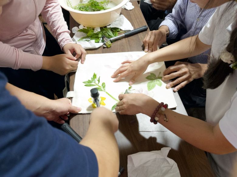 回到室內(nèi),兩位老師仔細示范操作,他們小心擺放好植物,用膠帶固定,拿起小錘子輕輕、有節(jié)奏地敲擊,邊講解敲擊力度與均勻度的要點。“咚咚”聲中,植物汁液滲入帆布袋,形成栩栩如生的圖案。而大家圍在旁邊,眼睛緊緊盯著,生怕錯過任何一個細節(jié)。
