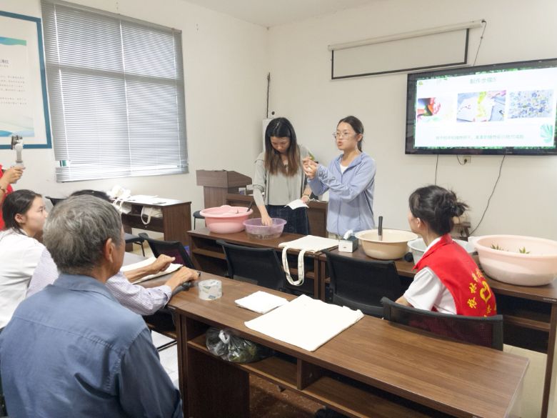聽完講解,大家在老師和志愿者帶領(lǐng)下歡喜地來到戶外。基地綠草如茵、繁花似錦,宛如植物寶藏庫;孩子們?nèi)缈鞓肪`,在綠葉花叢中蹦跳;老人們不緊不慢,仔細挑選葉片與花朵。志愿者們也沒閑著,在幫忙的同時為孩子們講解植物知識,現(xiàn)場其樂融融。不一會兒,大家籃子里就裝滿了綠葉、鮮花與草莖,仿佛裝進了整個夏天。