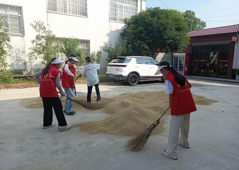 村口的曬谷場(chǎng)是最先熱鬧起來(lái)的地方。農(nóng)戶(hù)家的稻谷剛曬透,金黃的谷粒在地上鋪開(kāi),像一片陽(yáng)光織成的海。隊(duì)員們挽起袖子,彎腰用工具將稻谷歸攏。汗水順著隊(duì)員們的額角滴進(jìn)谷堆,混著谷物的清香,成了最特別的“防曬霜”。每個(gè)人的衣服都已濕透,卻沒(méi)人喊累——看著鼓鼓囊囊的糧倉(cāng),仿佛握住了沉甸甸的踏實(shí)。