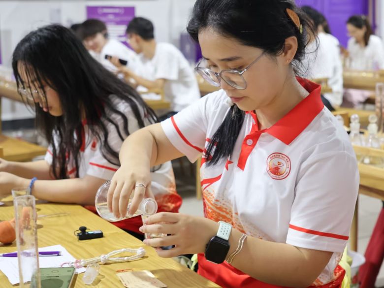在勾調(diào)體驗室,實踐隊員們迎來了核心的動手環(huán)節(jié)化身“調(diào)酒師”,首先進行聞香品鑒,專注辨別七個輪次基酒的風味譜系:從一輪次的“清新果香”逐漸遞進到七輪次的“醇厚焦香”,境界漸深,層次分明。隨后,在講解老師的指導下親手調(diào)制,按照建議比例精心混合不同輪次基酒。這一過程不僅是對味蕾的挑戰(zhàn),更讓青年學子們親身體驗了“或甘或苦皆自釀”的釀造哲理,感悟匠心與人生的微妙關聯(lián)。