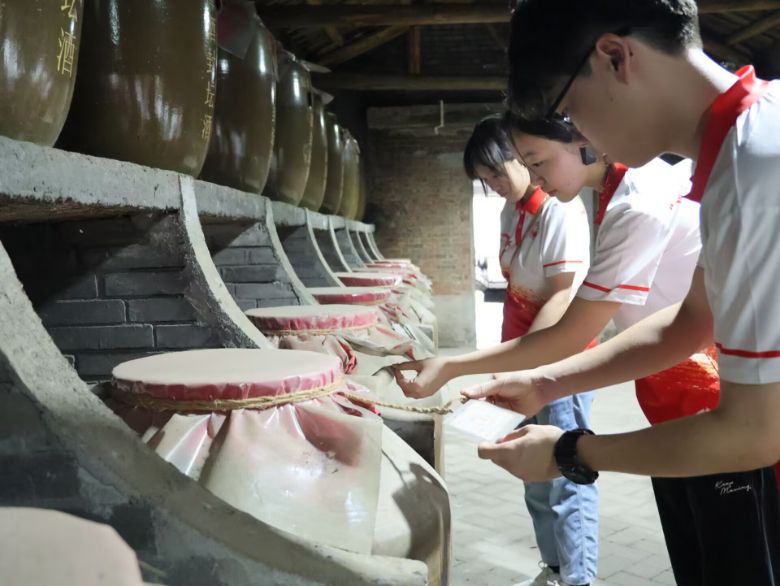 步入恒溫陶壇庫房,兩千余口陶壇靜默佇立。實踐隊員們輕撫斑駁壇壁,感知歲月沉淀的厚重。講解老師介紹:“每一壇酒都清晰標注年份,存儲五年以上方能稱為老酒。”這一“敢標真年份,內(nèi)行喝潭酒”的鄭重承諾,彰顯了企業(yè)堅守誠信的決心。