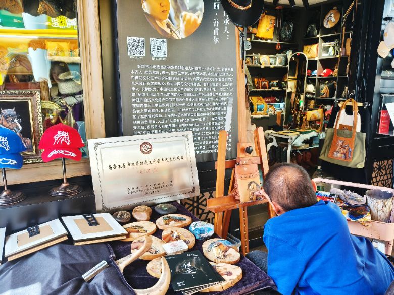 轉(zhuǎn)過銅器攤位,手工皮雕的匠人正以刀為筆,在皮革上鐫刻新疆的壯美山河。除了傳統(tǒng)的花卉、動(dòng)物圖案,如今的皮雕作品中,雪山、草原等自然風(fēng)光成為新靈感,通過立體雕刻技法,讓皮革“講述”更多地域故事,為非遺技藝注入時(shí)代氣息。