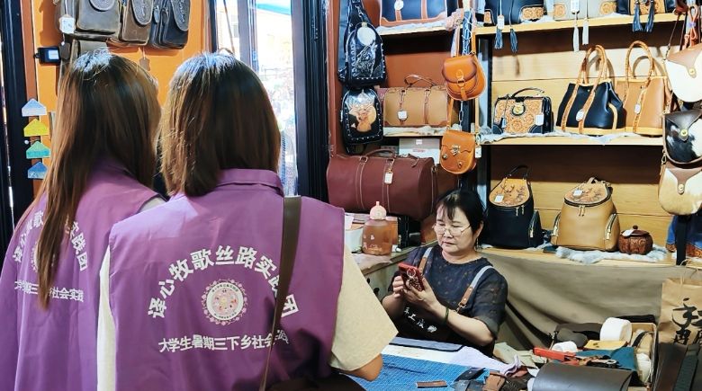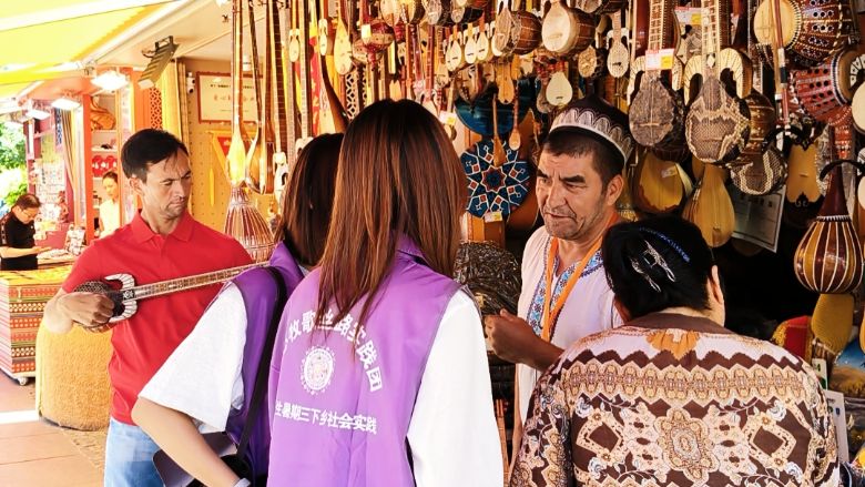7月10日,譯心牧歌絲路實(shí)踐團(tuán)走進(jìn)烏魯木齊國際大巴扎,在這片濃縮了新疆風(fēng)情的文化沃土上,探訪了馕、艾德萊斯綢、奧卜力銅器、手工皮雕及傳統(tǒng)手鼓等非遺技藝,近距離感受非遺商戶們在堅(jiān)守傳統(tǒng)中尋求創(chuàng)新的生動(dòng)實(shí)踐。