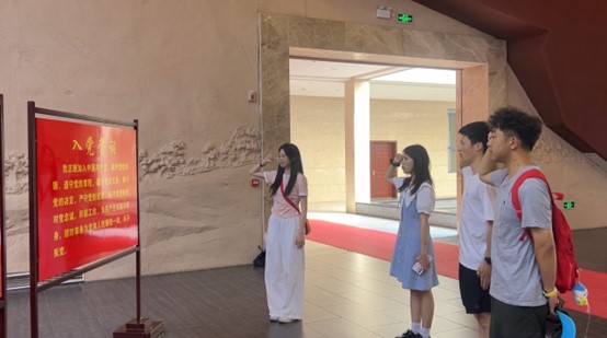 在參觀活動(dòng)的尾聲,肅穆的氛圍中,實(shí)踐團(tuán)全體成員整齊列隊(duì)于紀(jì)念館莊重的展廳。他們目光如炬,神情堅(jiān)毅,共同凝視著那面鮮紅如火的黨旗。在黨員劉迪嘉的帶領(lǐng)下,成員們莊重地舉起緊握的右拳,以飽滿(mǎn)的熱情和堅(jiān)定的信念,重溫入黨誓詞。“我志愿加入中國(guó)共產(chǎn)黨……”那鏗鏘有力、擲地有聲的誓言,在承載著厚重歷史的展館內(nèi)久久回蕩,仿佛與革命先輩們穿越時(shí)空的吶喊遙相呼應(yīng)。這一刻,歷史的回響激蕩著青春的脈搏。