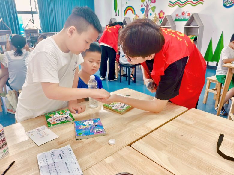 (圖為志愿者老師給小朋友分發(fā)材料)