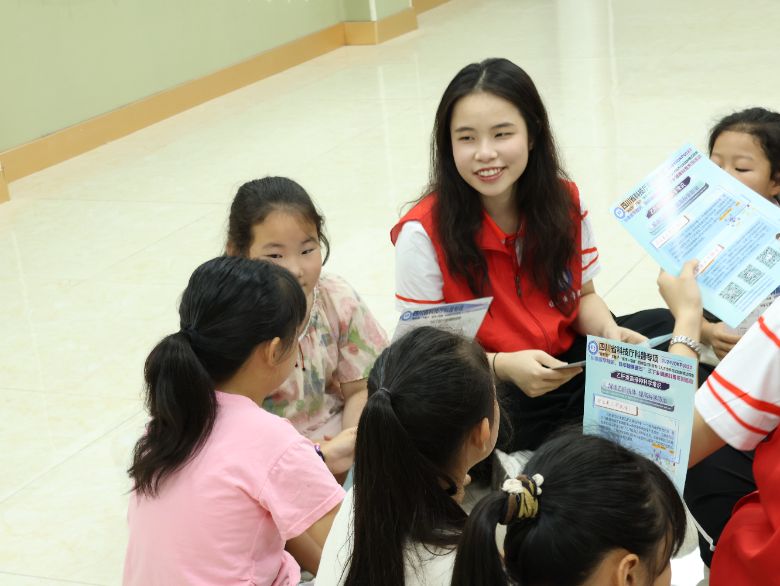 ▲圖為實踐隊員在古藺縣崇文社區(qū)開展兒童健康關(guān)愛科普活動