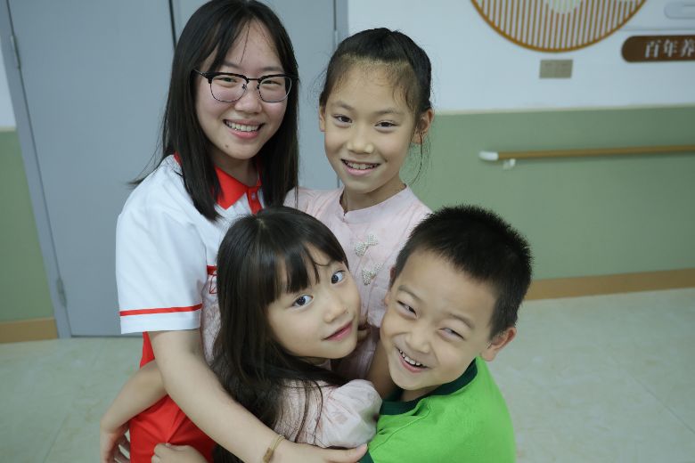 ▲圖為實踐隊員和小朋友在做“向陽花抱抱團”游戲