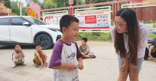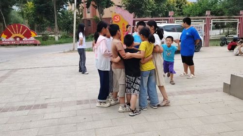 完成輔導(dǎo)后,實(shí)踐團(tuán)成員帶領(lǐng)孩子來到了戶外,開展了丟手絹、抱團(tuán)等經(jīng)典游戲。隨著歡快的歌聲響起,丟手絹游戲正式開始。孩子們圍坐成一圈,眼睛緊緊盯著身后慢慢走動(dòng)的小伙伴,氣氛緊張又興奮。當(dāng)手絹被悄悄放下,一場(chǎng)激烈的追逐賽瞬間展開,歡笑聲、加油聲此起彼伏,回蕩在整個(gè)活動(dòng)場(chǎng)地。抱團(tuán)游戲中,孩子們根據(jù)指令迅速組合,在一次次奔跑和擁抱中,不僅鍛煉了反應(yīng)能力,更增進(jìn)了彼此之間的友誼。