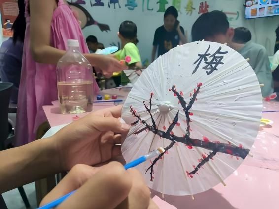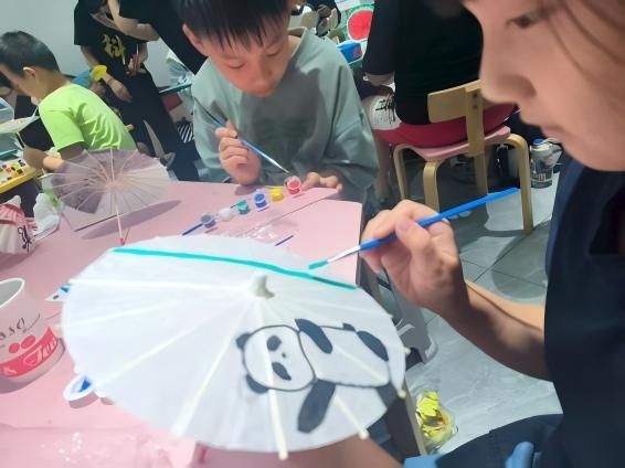 最讓孩子們期待的,莫過(guò)于油布傘DIY體驗(yàn)環(huán)節(jié)。團(tuán)隊(duì)提前準(zhǔn)備了半成品傘面、顏料和畫(huà)筆,當(dāng)材料包分發(fā)到手中時(shí),孩子們立刻化身“小小設(shè)計(jì)師”,迫不及待地拿起畫(huà)筆施展創(chuàng)意:有的畫(huà)上獨(dú)特氣質(zhì)的梅花,有的畫(huà)上熊貓吃竹子的場(chǎng)景……原本素凈的傘面,在孩子們的巧手下變成了一幅幅充滿童趣的“傘面畫(huà)”。