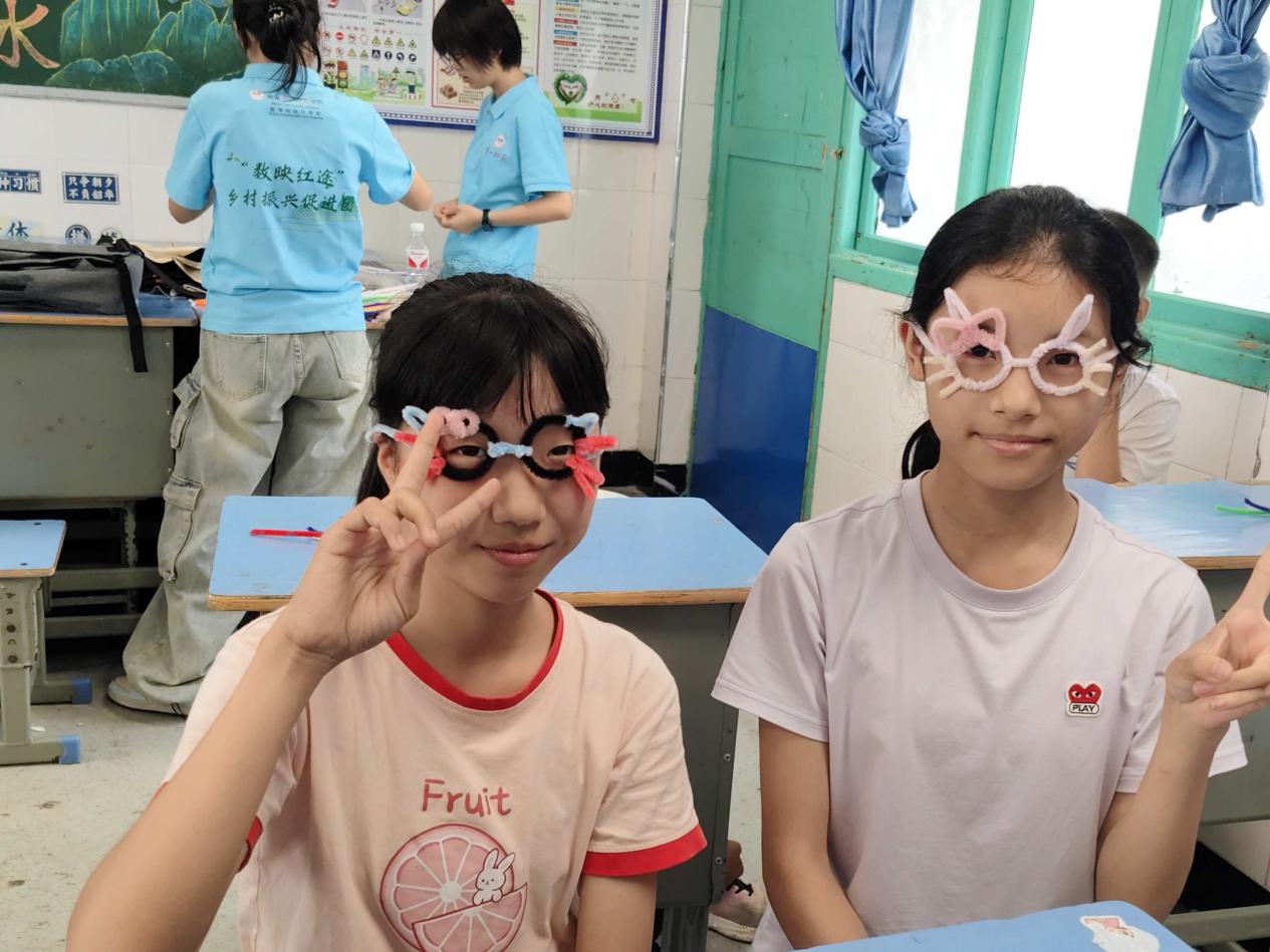 學生們專注投入,有的用粉色扭扭棒做出蝴蝶結鏡架,有的在鏡框兩側加上“小翅膀”,不時舉手向夏坤榮老師請教固定技巧。“老師,我的鏡腿總歪怎么辦?”“可以在連接處多擰兩圈,像這樣”,她俯身指導,手把手調整角度。一節(jié)課下來,近20名學生完成了專屬作品,戴上自制眼鏡互相“扮酷”,教室里笑聲不斷。