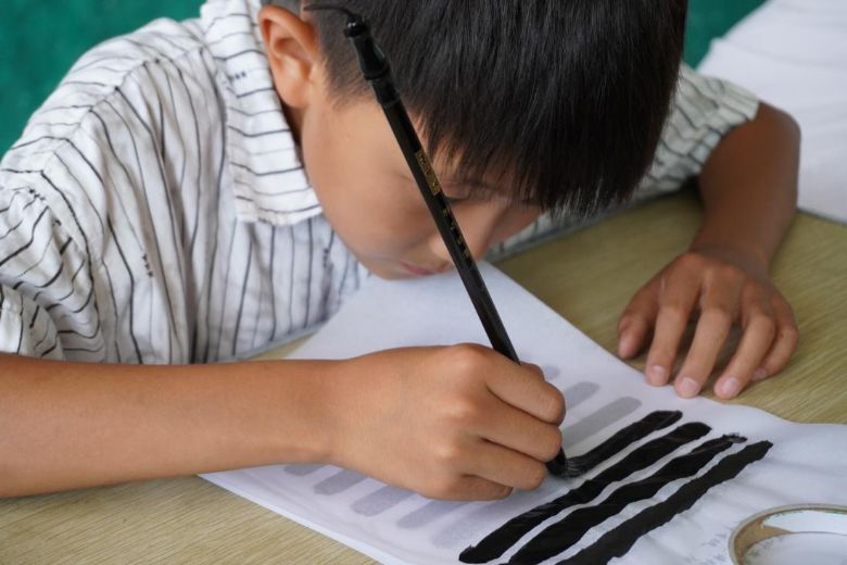 圖五:同學(xué)認(rèn)真進行毛筆的橫線練習(xí)。