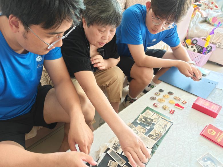 圖為實(shí)踐團(tuán)成員聆聽革命前輩后代講解前輩革命事跡和翻閱舊相冊(cè)與功勛章 王錦泉攝