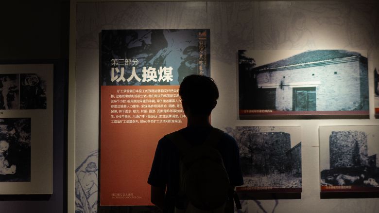 大通萬人坑教育館內(nèi),昏暗的燈光下,一排排礦工遺骸靜靜陳列,銹跡斑斑的鐐銬、殘缺的礦燈與泛黃的照片,無聲還原著1938年至1945年間日軍在此的暴行。