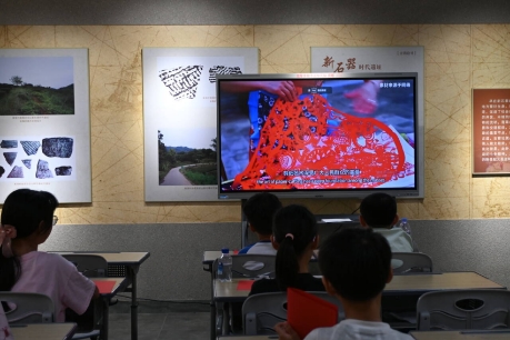 圖為用視頻展示的方式了解剪紙。吳一虹 攝