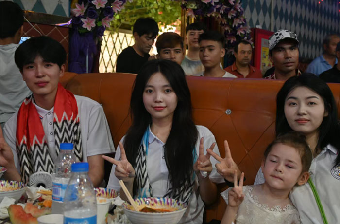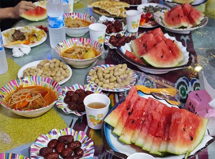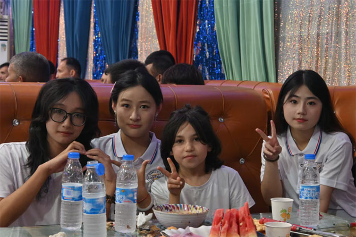 婚禮現(xiàn)場(chǎng),餐桌間早已擺滿新疆的特色美食。金黃油亮的手抓飯上點(diǎn)綴著葡萄干和羊肉塊,散發(fā)著濃郁的香氣;切成小塊的哈密瓜、西瓜,甜絲絲的汁水驅(qū)散了暑氣。維吾爾族小朋友們拿起“老漢瓜”,挨個(gè)遞給師生們,用不太流利的漢語說:“姐姐,吃,甜。”實(shí)踐團(tuán)的同學(xué)們也拿出手機(jī)里關(guān)于重慶特色美食的圖片,笑著說:“等下次有機(jī)會(huì),我們也讓大家試試重慶的特色美食!”不同地域的美食在這里相遇,碰撞出別樣的滋味,也拉近了彼此的距離。