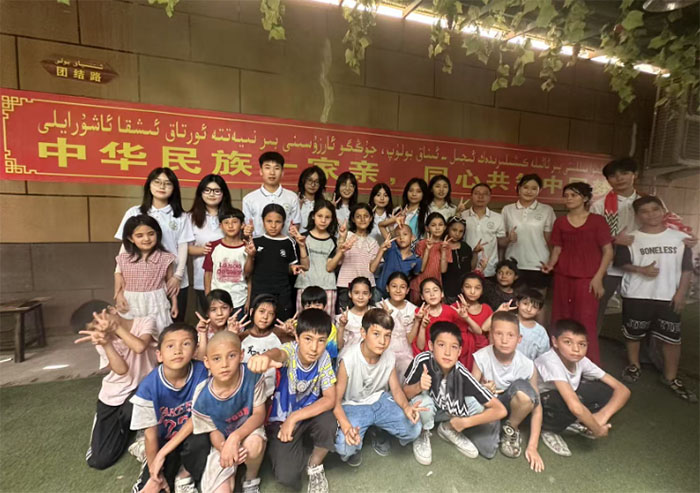 婚禮在漸漸低回的樂聲中落下帷幕,學(xué)子們的行囊里,悄悄多了幾樣特殊的“收獲”:縈繞耳畔、揮之不去的十二木卡姆旋律,肩頭象征民族團(tuán)結(jié)的艾德萊斯綢,還有維吾爾族小朋友們綻放著熱情與純真的笑臉。這些帶著溫度的“物件”,成了民族團(tuán)結(jié)最生動(dòng)的見證。實(shí)踐團(tuán)成員們說,這次“三下鄉(xiāng)”之旅,讓他們讀懂了“各民族像石榴籽一樣緊緊抱在一起”的深刻含義。未來,他們將帶著這份滾燙的記憶,繼續(xù)行走在非遺傳承與鄉(xiāng)村振興的路上,讓青春在促進(jìn)民族團(tuán)結(jié)的實(shí)踐中綻放光彩。