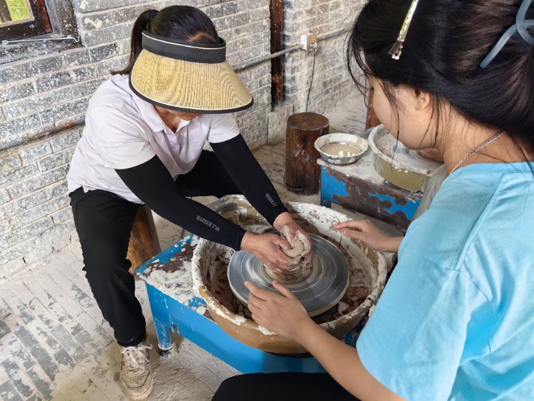 轉(zhuǎn)至陶瓷工坊,泥土在匠人指尖悄然“蘇醒”。只見(jiàn)雙手翻飛如蝶。泥坯頃刻轉(zhuǎn)化作碗、瓶、盞的雛形。工坊的角落里,幾名隊(duì)員嘗試上手體驗(yàn),泥坯卻在旋轉(zhuǎn)中歪斜變形。這一刻,隊(duì)員們真切體會(huì)到“工匠精神”的分量——它不僅是技藝的傳承,更是對(duì)浮躁時(shí)代的一種無(wú)聲回應(yīng)。