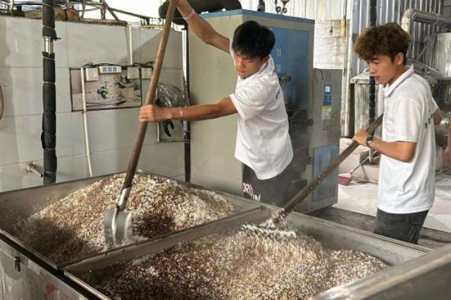 在當?shù)刎撠熑它S平的帶領下,實踐團深入糧食釀酒生產(chǎn)線,親歷傳統(tǒng)固態(tài)發(fā)酵工藝的魅力。同學們動手參與關鍵環(huán)節(jié):將高粱、糯米、玉米、紅豆、綠豆等多樣糧食科學配比、混合均勻,經(jīng)歷泡米、蒸煮的初加工后,送入發(fā)酵池開啟神奇的轉化之旅。負責人特別強調,發(fā)酵完成后需經(jīng)蒸餾提純,并警示“頭道酒”因含對人體有害物質必須舍棄,確保了最終酒品的純正安全。