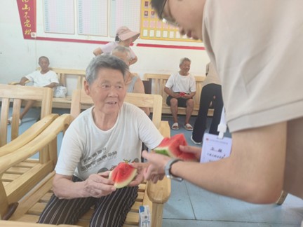進(jìn)入敬老院,老人們正在觀看電視劇,踐行團(tuán)成員迅速融入老人中間與老人們一起聊天,成員們一句句親切的"爺爺"、"奶奶",如同開啟心門的鑰匙。待到氣氛正濃時,成員們將帶來的西瓜與牛奶一同送到老人們手中。夏日酷暑中,這份甘甜不僅滋潤了喉嚨,更讓老人們感受到來自年輕一代細(xì)致入微的關(guān)懷。