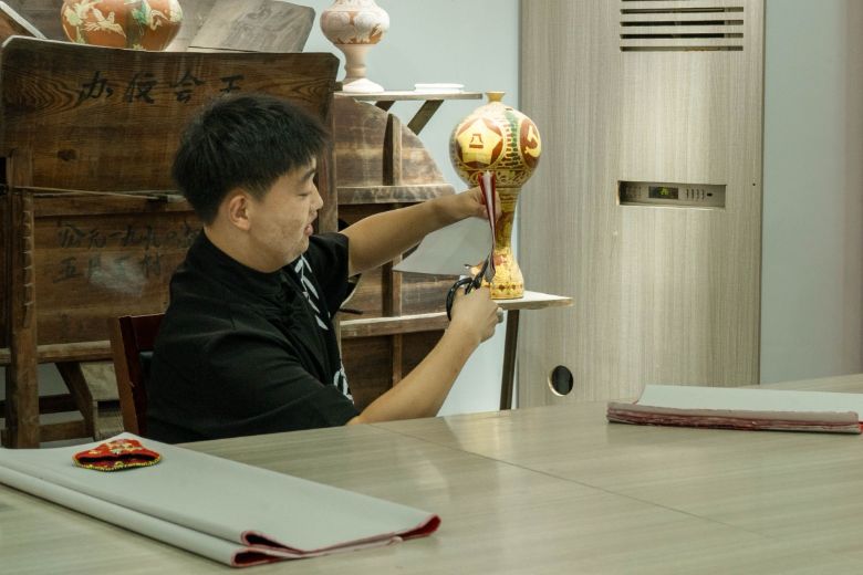 成員們體驗時,在剪刀轉折、力道控制上頻頻“踩坑”,經(jīng)劉廣軍指導“剪紙講究‘穩(wěn)、準、巧’,要順紋理、靠手感”,才完成粗糙卻充滿成就感的作品。“希望大學生用新媒體、AI等新辦法推廣界首文化。”劉廣軍的期盼,讓團隊感受到傳承人的匠心與創(chuàng)新意識。