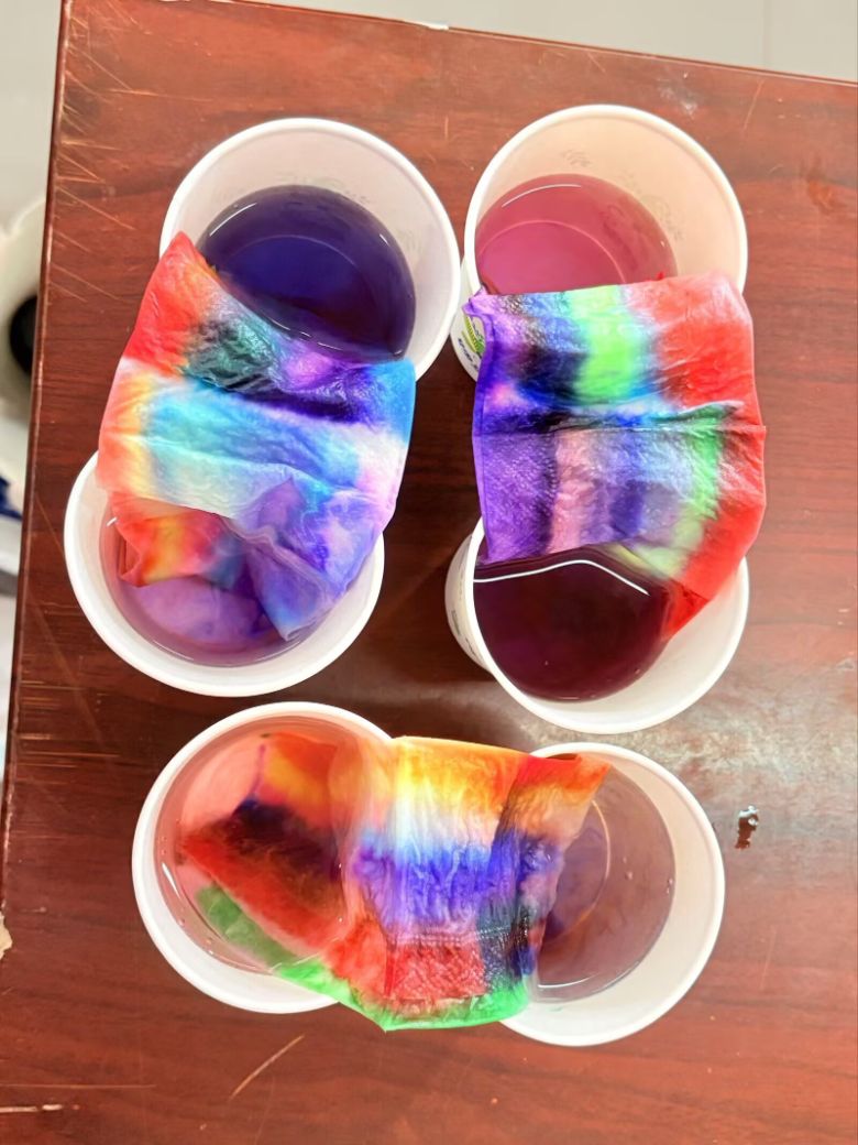 下午的活動則充滿了探索的樂趣。志愿者們精心準備了包括“彩虹橋”“色素遇上鹽”在內(nèi)的五個簡單易操作的化學實驗。實驗過程中,孩子們瞪大好奇的眼睛,看著透明液體變成鮮艷的顏色、紙巾兩邊的“彩虹”慢慢相連,不時發(fā)出陣陣驚嘆。志愿者們還邀請小朋友們親自上手操作,在指導下添加試劑、觀察變化,讓他們在實踐中感受化學的奇妙。
