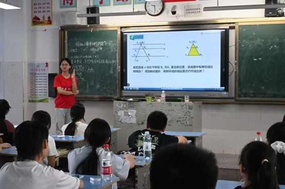 在探究環(huán)節(jié),鄒老師以問題串引導(dǎo)學(xué)生逐步深入:“如果平行線截的是三角形的兩邊,會(huì)得到什么結(jié)論?”學(xué)生們通過平移平行線,觀察圖形變化,發(fā)現(xiàn)所截線段依然成比例。鄒燁老師適時(shí)引入“A型”和“X型”模型,結(jié)合動(dòng)畫演示,讓學(xué)生直觀理解平行線分線段成比例的推論。
