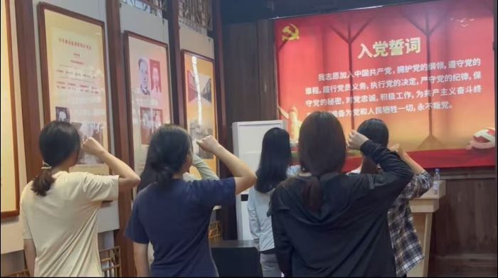 隨后,實(shí)踐隊(duì)一行前往中共福州市委舊址。在這座見證了福州解放前夕斗爭(zhēng)歷史的建筑里,一張張珍貴的老照片、一件件銹跡斑斑的革命文物,串聯(lián)起1947年至1949年間福州人民開展武裝斗爭(zhēng)、迎接解放的壯麗篇章。講解員詳細(xì)介紹了“福州學(xué)聯(lián)”組織學(xué)生運(yùn)動(dòng)、“城工部”秘密發(fā)展黨員等歷史細(xì)節(jié),同學(xué)們不禁為先輩們的智慧與勇氣深深折服。在舊址庭院內(nèi),實(shí)踐隊(duì)成員整齊列隊(duì),面向鮮紅的黨旗舉起右拳。“我志愿加入中國(guó)共產(chǎn)黨,擁護(hù)黨的綱領(lǐng),遵守黨的章程……”鏗鏘有力的宣誓聲穿越時(shí)空,與當(dāng)年革命先輩的吶喊遙相呼應(yīng)。