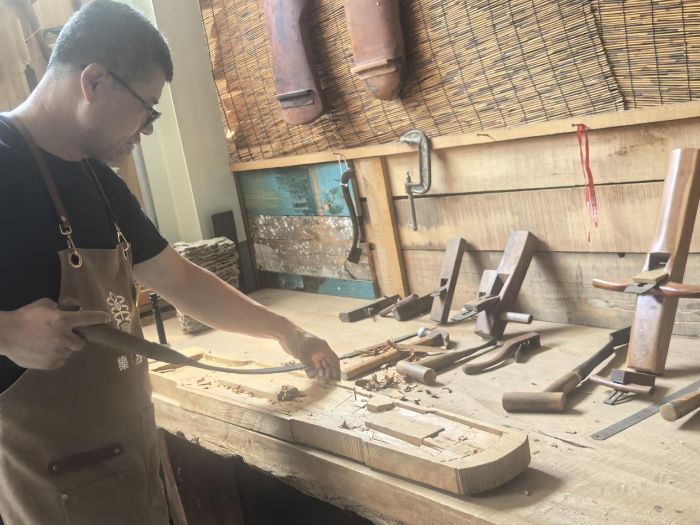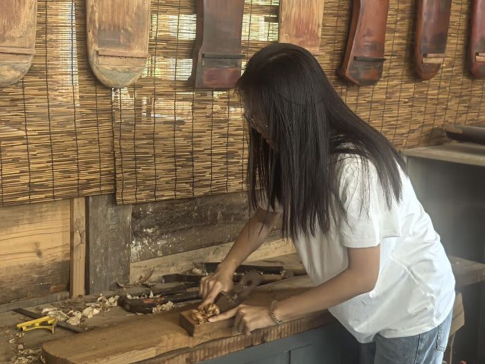 圖為薪傳社會實踐隊隊員體驗古琴的制作技藝。孔令雯 攝