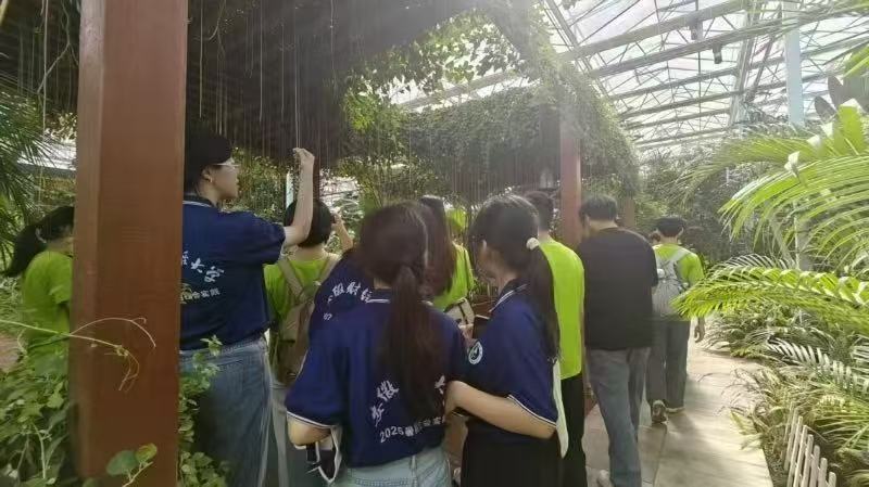 實踐隊首站探訪熱帶植物展示館,講解員引導(dǎo)團(tuán)隊參觀,逐一介紹館內(nèi)熱帶植物的生長習(xí)性和實用價值,并著重說明館內(nèi)通過環(huán)境控制系統(tǒng)、新風(fēng)系統(tǒng)及視頻監(jiān)測系統(tǒng)等技術(shù),實現(xiàn)對室溫、灌溉、通風(fēng)的精準(zhǔn)調(diào)控,為植物提供適宜條件。團(tuán)隊認(rèn)真聽講,對科技在植物培育中的應(yīng)用表現(xiàn)出濃厚興趣。