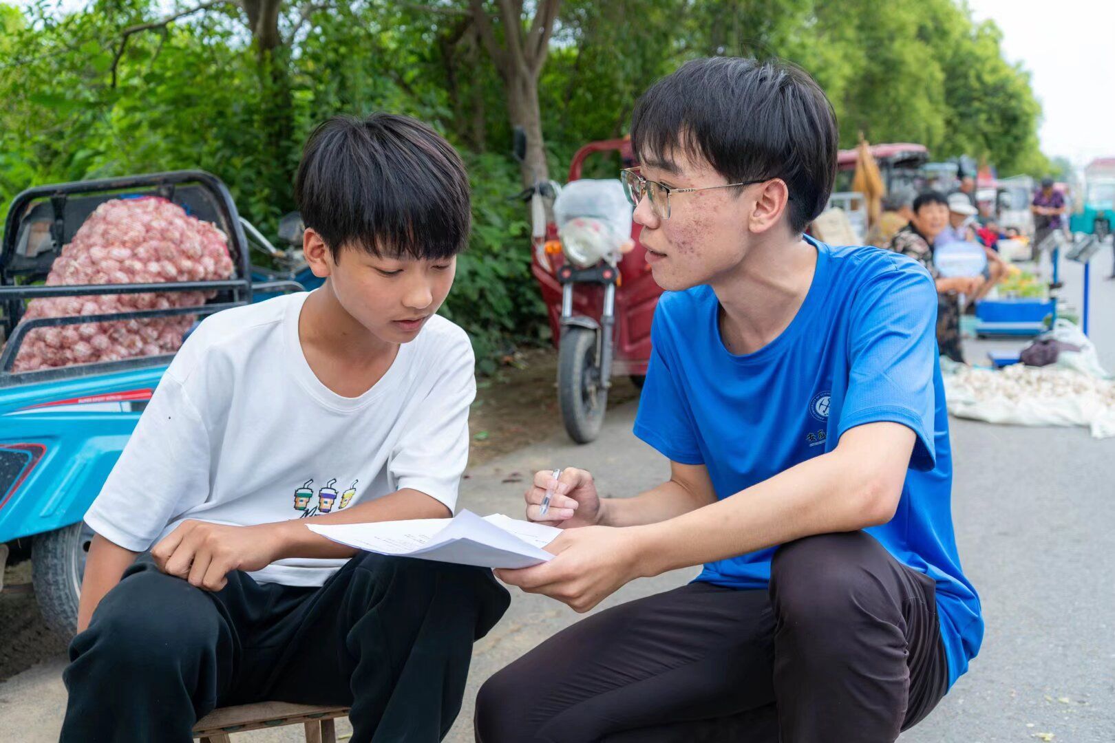 街頭調(diào)研:聆聽大眾聲音 實(shí)踐團(tuán)還將調(diào)研延伸至街頭。界首集市上,藍(lán)隊(duì)服成員與白衣少年對(duì)坐,成員持問(wèn)卷詢問(wèn)少年對(duì)界首剪紙的認(rèn)知。少年專注回應(yīng),身旁三輪車堆著農(nóng)產(chǎn)品,集市成獲取大眾反饋的場(chǎng)域。 這展現(xiàn)團(tuán)隊(duì)從廣泛群體獲取信息的努力,老一輩堅(jiān)守、青少年認(rèn)知,都是非遺傳承生態(tài)部分。通過(guò)調(diào)研,團(tuán)隊(duì)勾勒界首剪紙?jiān)诖蟊娚钅,為傳承策略制定匯聚民間力量。