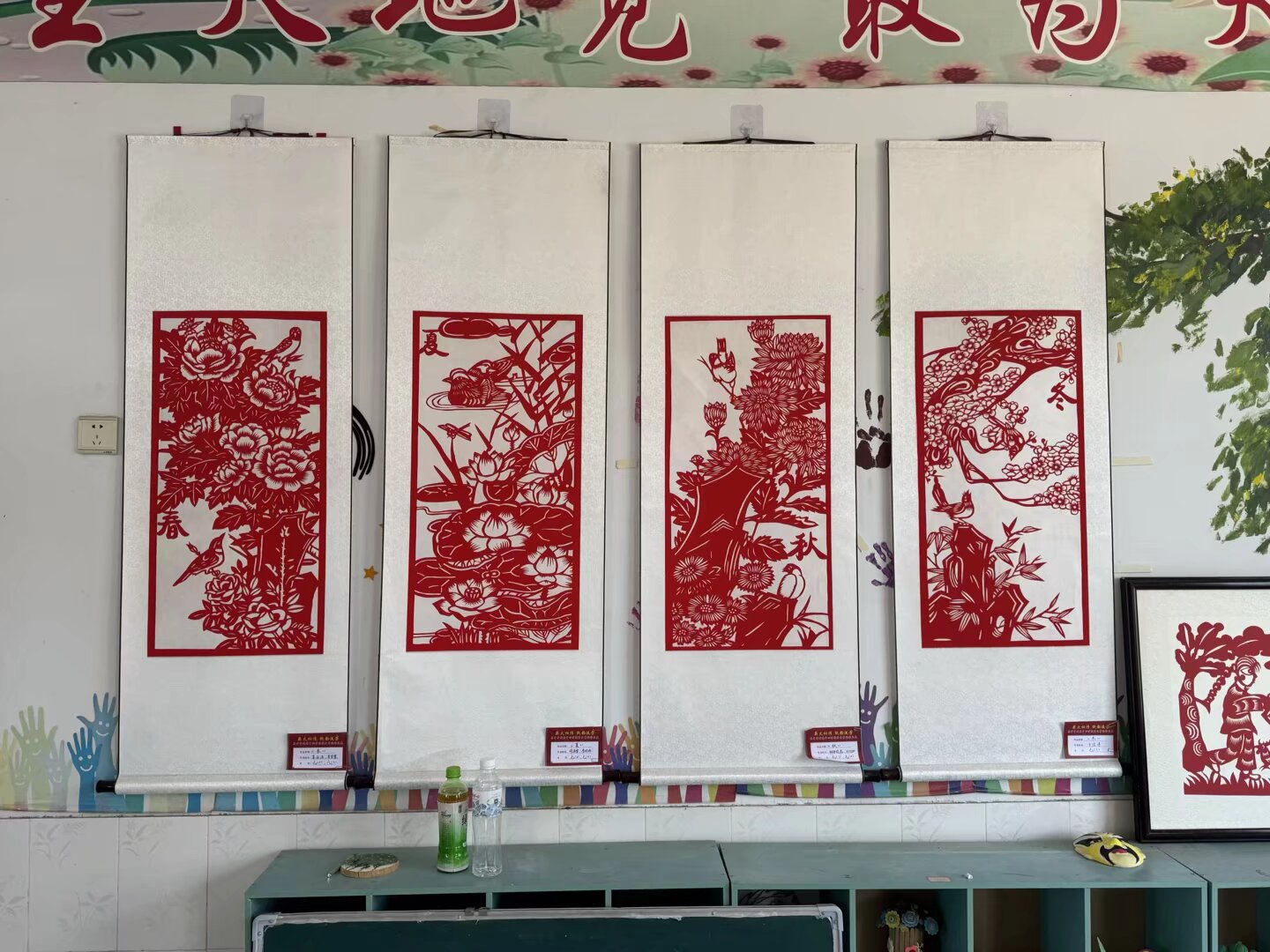 剪紙作品展示:定格藝術(shù)之美 實(shí)踐活動(dòng)中,界首剪紙作品亮眼。四幅“春夏秋冬”主題作品,紅底白襯裝裱懸掛,精細(xì)剪刻四季花卉、鳥獸,展現(xiàn)精湛技藝與深厚內(nèi)涵,是非遺傳承成果直觀體現(xiàn),讓成員與大眾領(lǐng)略其藝術(shù)魅力與文化價(jià)值。