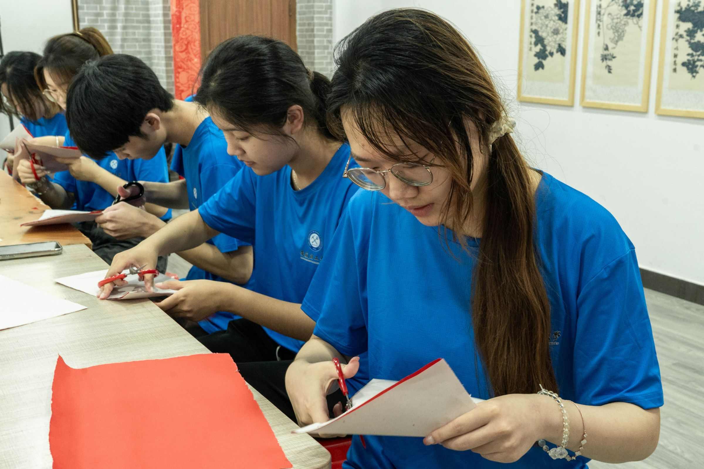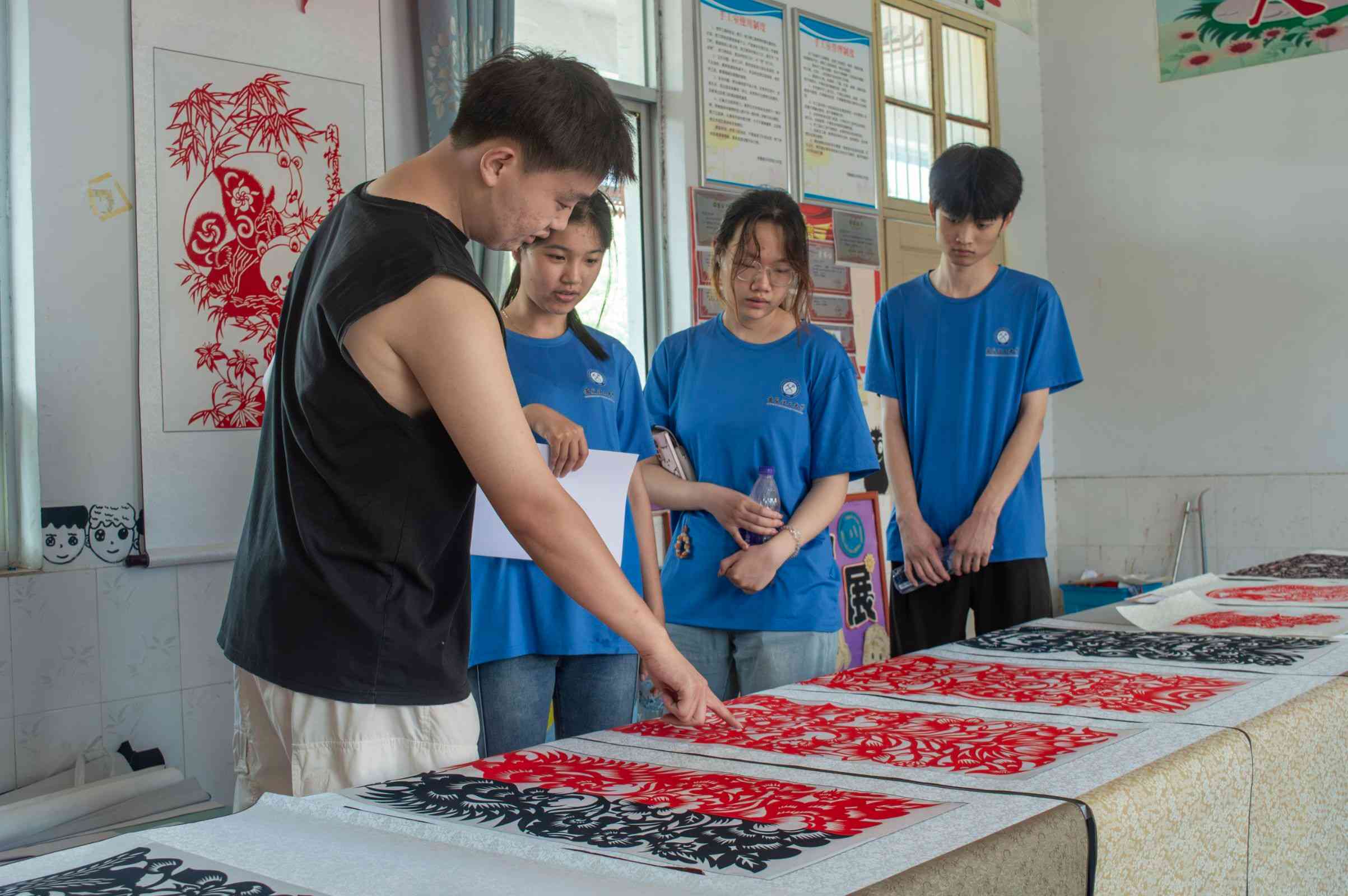 圖為團(tuán)隊(duì)成員學(xué)習(xí)剪紙 田澤坤 供圖