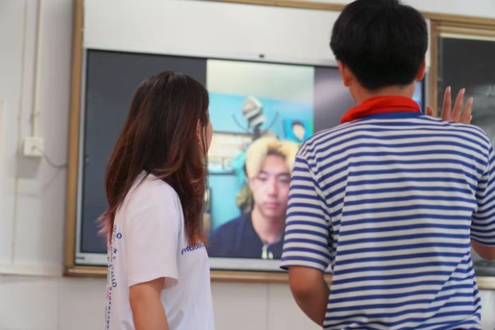 突破傳統(tǒng)課堂框架,實踐隊創(chuàng)新設計系列特色活動,讓英語學習從課本走向生活,從被動接受變?yōu)橹鲃犹剿鳌?br />“跨國云端對話” 成為課堂最大亮點。實踐隊提前聯(lián)絡海外友人,搭建視頻連線平臺。當屏幕那頭傳來 “Hello, everyone” 的問候時,孩子們雖緊張卻難掩興奮,在老師鼓勵下紛紛舉手用英語回應,實現(xiàn)了與外國友人面對面交流的突破,讓語言在真實對話中綻放活力。