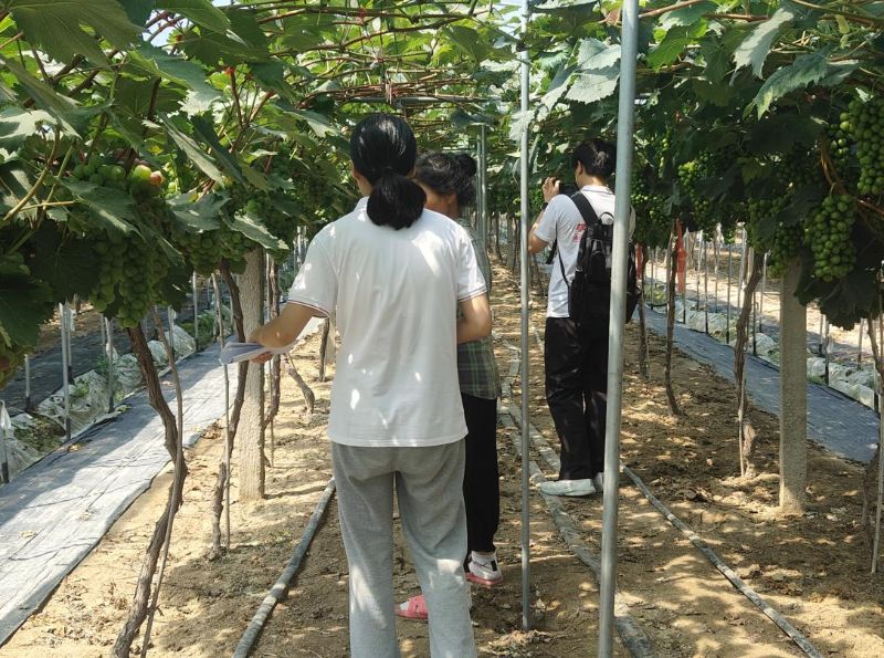 為積極響應(yīng)和落實政府出臺的“加快發(fā)展智慧農(nóng)業(yè)”的文件,進(jìn)一步了解農(nóng)業(yè)生產(chǎn)效率、農(nóng)產(chǎn)品的質(zhì)量,2025年7月3日,巢湖學(xué)院赴同大鎮(zhèn)及王家壩“智匯農(nóng)業(yè),數(shù)聯(lián)鄉(xiāng)村”智慧農(nóng)業(yè)發(fā)展調(diào)研團(tuán)成員在安徽省合肥市廬江縣同大鎮(zhèn)馬河村葡萄觀光長廊參觀調(diào)研。抵達(dá)目的地后,調(diào)研團(tuán)成員們被眼前這片生機(jī)勃勃的景象深深吸引。葡萄觀光長廊如一條翠綠的綢帶,蜿蜒伸展在廣袤的田野之上,不僅為大地披上了絢爛的夏裝,更以其獨特的魅力吸引著四面八方的游客前來觀光體驗。長廊下,一串串晶瑩剔透的葡萄掛滿枝頭,仿佛是大自然精心布置的珠寶,散發(fā)著誘人的光澤和香氣,預(yù)示著又一個豐收年的到來。