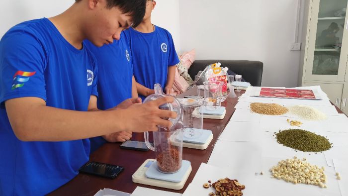 7月5日,生命科學(xué)與工程學(xué)院“青耘良西-青春興農(nóng)實(shí)踐團(tuán)”在駐地開展產(chǎn)品轉(zhuǎn)化實(shí)踐;7月4日初步確定并經(jīng)過試喝的“五色養(yǎng)心粥”營養(yǎng)配方及比例,團(tuán)隊成員進(jìn)行了原料采購,并按標(biāo)準(zhǔn)配置、封裝了三斤裝與五斤裝兩種規(guī)格的產(chǎn)品。