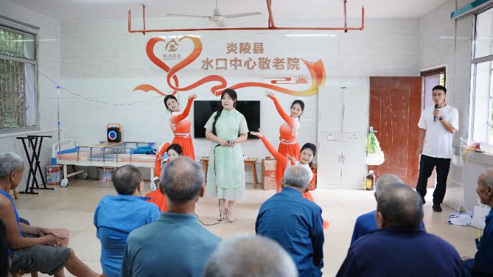 炎陵水口鎮(zhèn)敬老院里,青春與銀發(fā)共舞。文創(chuàng)組教老人用扭扭棒編出“向陽(yáng)花”“如意結(jié)”,齊耳短發(fā)奶奶高舉作品:“這朵花,我要?jiǎng)e在胸口!”“藝青年”李響唱起《我的祖國(guó)》,曾為軍人的爺爺指尖微顫,淚光中映著烽火歲月。《燈火里的中國(guó)》旋律悠揚(yáng),老人合掌輕和。民族舞熱情奔放,中國(guó)舞衣袂翩躚,爺爺奶奶們隨節(jié)拍拍手,掌聲與笑聲撞了滿(mǎn)懷。文旅組架起“天安門(mén)”背景布,為老人拍攝“圓夢(mèng)照”,并將活動(dòng)過(guò)程制成紀(jì)念視頻《青春暖夕陽(yáng)》。