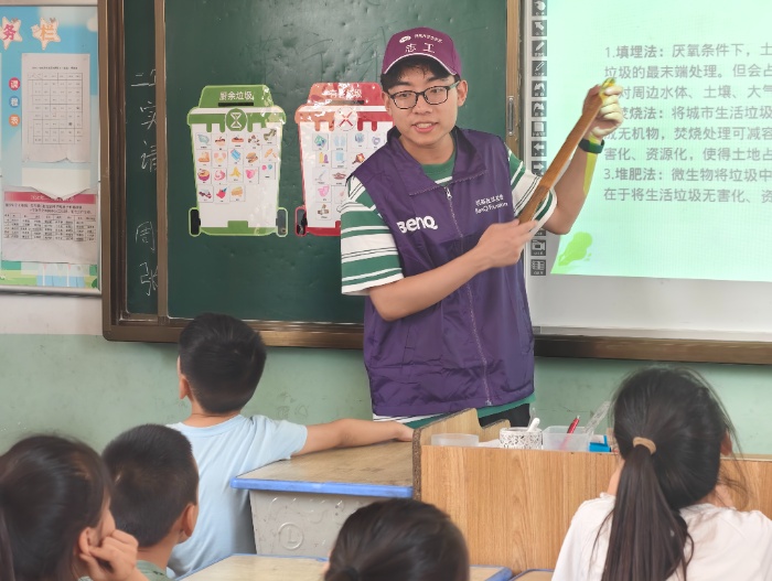 圖為團(tuán)隊(duì)成員徐陳佳向孩子們介紹垃圾處理方式。蔣梓涵 供圖