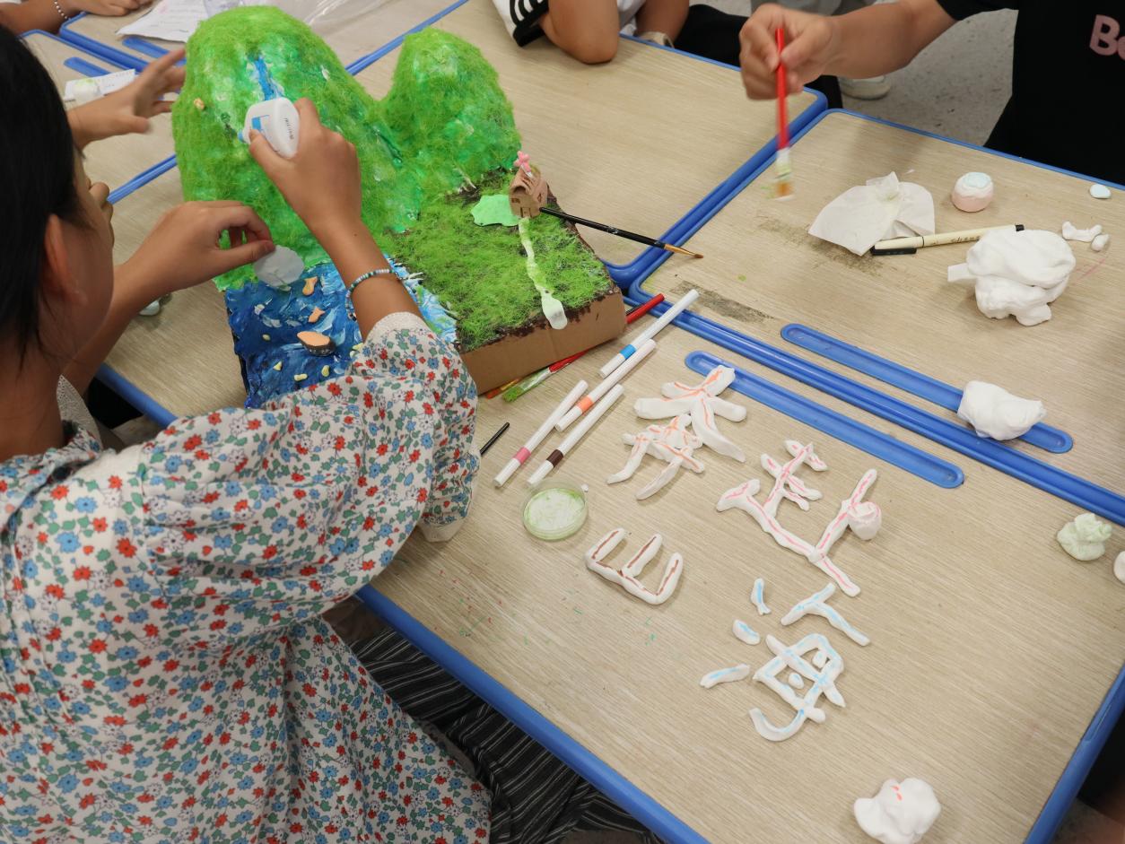 分組創(chuàng)作環(huán)節(jié),山區(qū)組、沿海組、農(nóng)業(yè)組的學(xué)生們充分發(fā)揮想象力,用黏土、顏料等材料構(gòu)建心中家鄉(xiāng)未來的模樣,深刻體會到“綠水青山就是金山銀山 ”,家鄉(xiāng)的發(fā)展離不開對生態(tài)環(huán)境的守護(hù)。