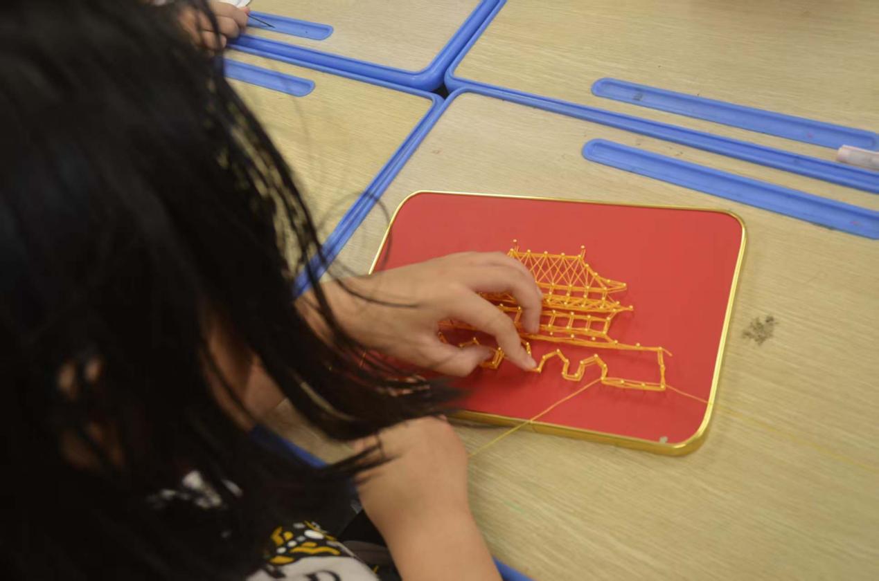 釘子畫制作環(huán)節(jié),學(xué)生們?nèi)褙炞,用釘子和彩線構(gòu)建心中的美好圖景,體悟著“久久為功”的深刻內(nèi)涵。
