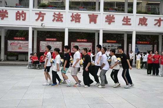 “預(yù)備——開(kāi)始!”隨著哨聲響起,九名學(xué)生立刻化身“連體小火車(chē)”,他們側(cè)身夾著排球,喊著整齊的“左右左”口號(hào)。排球像被施了魔法般穩(wěn)穩(wěn)卡在隊(duì)伍中,陽(yáng)光下躍動(dòng)的身影構(gòu)成了一道青春風(fēng)景線(xiàn)。突然第三組的排球開(kāi)始搖晃,“穩(wěn)。”隊(duì)長(zhǎng)急中生智放慢腳步,全隊(duì)跟著調(diào)整節(jié)奏,最終逆襲奪冠。